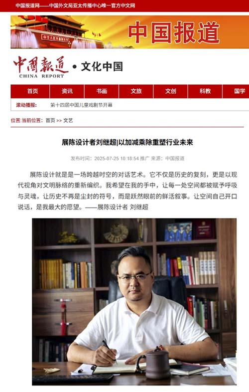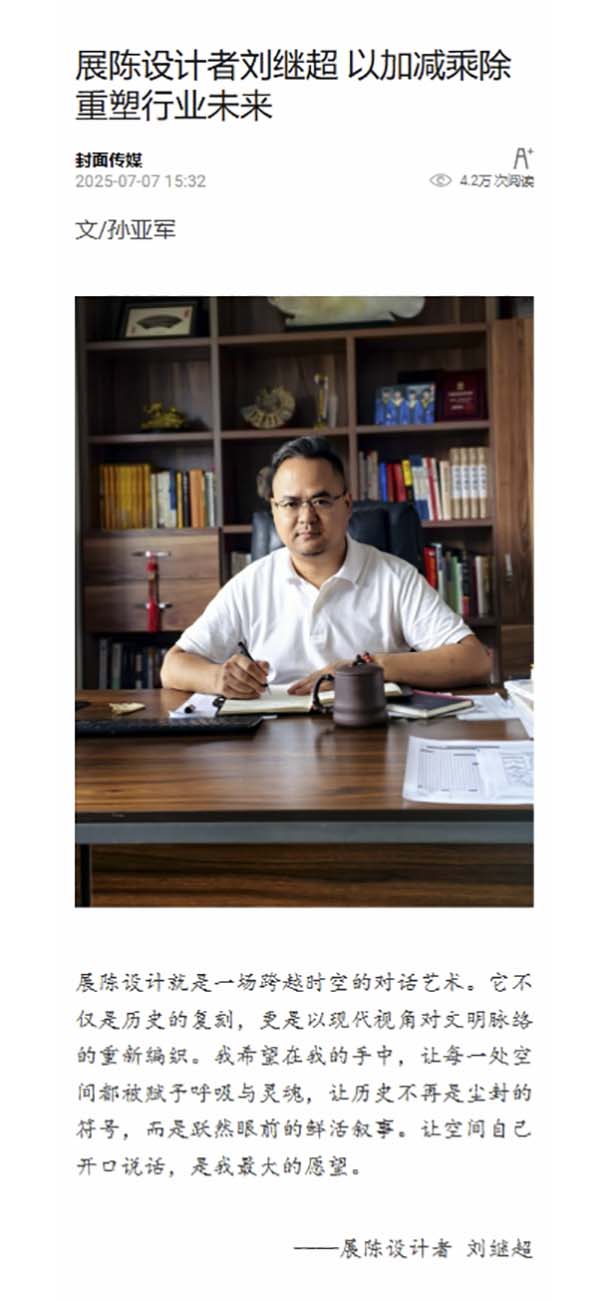 此次二次聚焦,不仅是对专业成就的肯定,更凸显社会价值 —— 展陈突破 “文化孤岛” 属性,成为城市文化治理柔性载体,赋能社区认同、公益科普与乡村振兴。刘继超以实践证明,展陈可穿透边界,链接专业与社会价值。未来,公司将继续以设计为核、生态为翼,书写展陈赋能文化传承、驱动城市创新的新篇章,期待与各界共赴行业新程,见证中国展陈从跟跑到领跑的跨越。