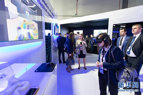 4月15日,在俄罗斯索契,一名参观者在俄罗斯国家原子能公司展区体验VR设备。 当日,第十一届俄罗斯国际核工业展览会在索契开幕。为期两天的展览会吸引来自全球74个国家的3600余人参与。